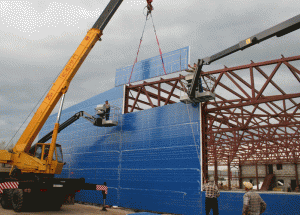 Погрузку и перевозку панелей обычно обеспечивает поставщик, разгружаются они на склад и используются по мере необходимости. Если листы упакованы, для разгрузки может использоваться техника, иначе придется обеспечивать их загрузку на склад вручную. Согласно заранее составленной технологической карте монтажники крепят панели к заранее установленному каркасу. Для строповки применяются клиновые захваты и страховочные тросы, что позволяет избежать повреждения при установке. Чтобы подать сэндвич в удаленные места, необходим вылет стрелы не менее 20 метров при грузоподъемности автокрана 25 тонн. Оптимальным выбором станет Ивановец или Галичанин.