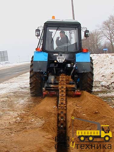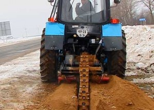 При невысокой цене отличным выбором для этих целей становится траншейный экскаватор, позволяющий создавать ямы при строительстве домов и дорог, укладке труб и кабелей, обустройстве фундаментов. Роторный или цепной агрегат монтируется на тягач, в качестве которого часто выступает трактор МТЗ-82, подключается к его гидравлической системе, дополняется отвалом. Он обеспечивает копку канавы шириной до 410 мм и глубиной до 1,6 м, может работать с любыми типами грунта.